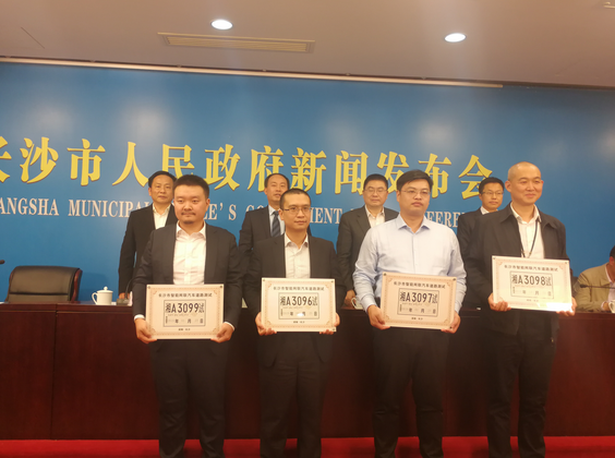 号牌分别发放给湖南中车时代电动汽车股份有限公司的智能驾驶公交、北京百度网讯科技有限公司的智能驾驶乘用车、长沙酷哇中联智能科技有限公司智能驾驶环卫作业车和长沙智能驾驶研究院有限公司的自动驾驶重卡。其中湖南中车时代电动汽车股份有限公司智能驾驶公交是全国第一个获得智能网联汽车开放道路测试号牌的自动驾驶公交车。
